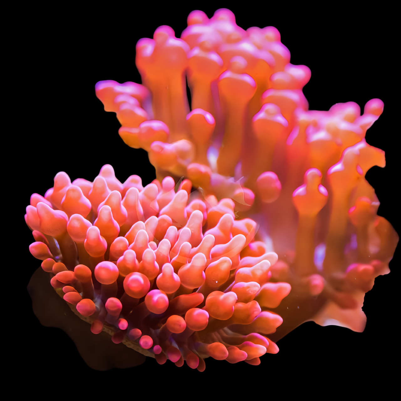 Bulb, Rose "Flamethrower" (Entacmaea quadricolor) is a semi-aggressive species that is reef-safe with caution, admired for its striking rose-red coloration, bulbous tentacle tips, vibrant size, and symbiotic relationship with clownfish. Males typically have smaller bodies with less vivid coloration, while females/juveniles are larger with more intense hues and fuller tentacles. They reach about 12 inches (30 cm) in diameter and should be housed in aquariums of at least 30 gallons.