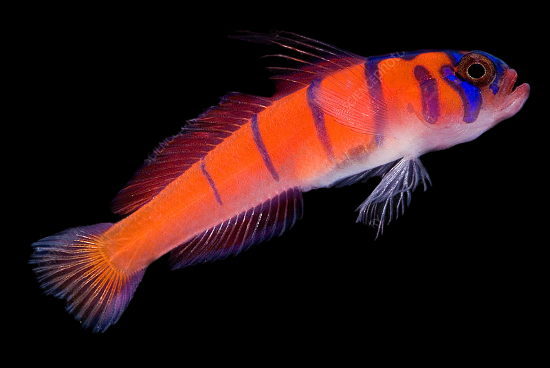 The Catalina Goby (Lythrypnus dalli) is a peaceful species that is reef-safe, admired for its brilliant reddish-orange body marked with electric-blue bands, small size, and bold, perching behavior that adds striking color and activity to aquariums.