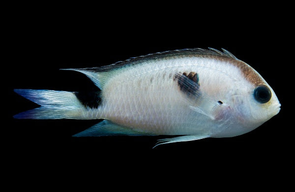 The Corazon's Damselfish (Pomacentrus vatosoa) is a semi-aggressive species that is reef-safe, admired for its pearly white body, contrasting dark saddle mark behind the gill plate, black dorsal shading, and shimmering blue highlights on the fins.
