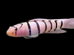 The Japanese Tiger Dartfish (Pterogobius elapoides) is a semi-aggressive species that is reef-safe with caution, admired for its distinctive tiger-like striped patterns, slender elongated body, and quick darting behavior. Males typically exhibit more intense coloration and may display territorial behavior, while females and juveniles tend to have lighter stripes and a more subdued appearance. They reach about 3 to 4 inches in adult size and should be housed in aquariums of at least 30 gallons.