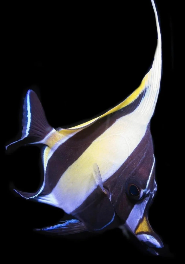 Moorish Idol (Zanclus cornutus) – The Moorish Idol is one of the most iconic and recognizable fish in the ocean, instantly identified by its bold black, white, and yellow bands and its long trailing dorsal fin. Revered for its beauty and elegance, this species has long been considered a symbol of good luck and prosperity. Growing up to 9 inches, Moorish Idols require spacious aquariums with ample swimming room, mature rockwork, and pristine water conditions. While known for being a challenging species due to specialized dietary needs, they are unmatched in beauty and are truly the crown jewel of any marine display when cared for properly.