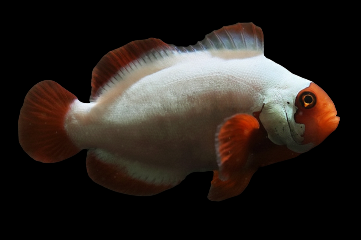 The Thunder Maroon Clownfish (Amphiprion biaculeatus) is an aggressive species that is considered reef-safe with caution, admired for its striking red-and-white coloration, bold contrasting patterns, and unique “marbled” appearance.
